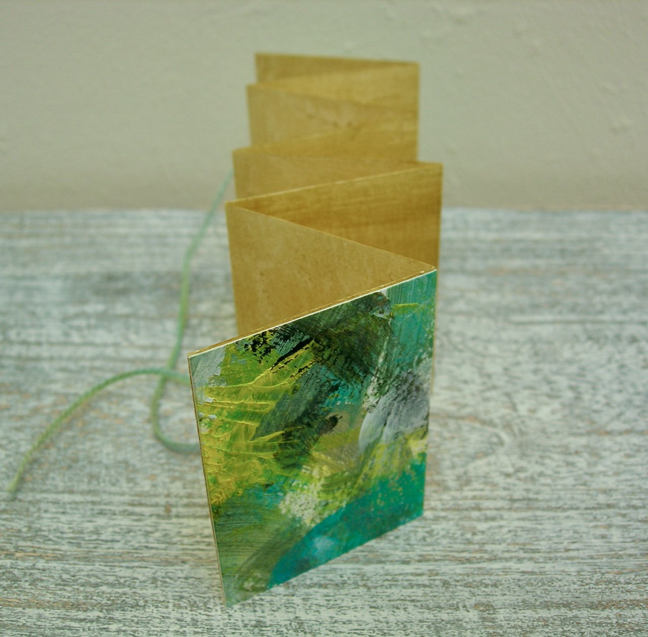 It is coloured inside with amber ink and the covers are a thin abstract painted card with a thread fastening.